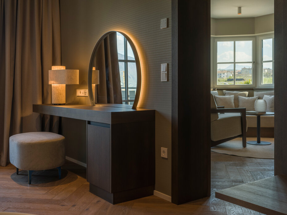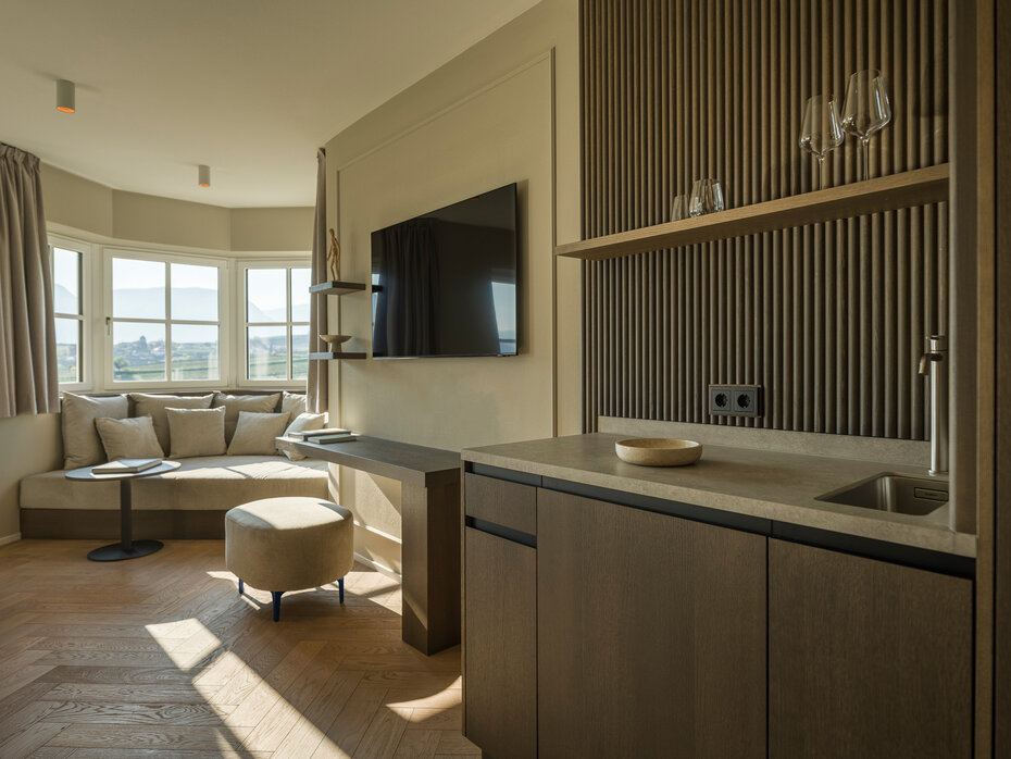Inspiration fand das Gestaltungsteam von ROOM2 in der einzigartigen Atmosphäre der umliegenden Ansitze und Weingärten sowie in der ländlichen Idylle rund um Girlan. Zarte Farben, elegante Linien, viel Liebe zum Detail und mit hochwertigen Materialien: Lingers Suiten und Apartments sind ein stylisher Rückzugsort mit edlem Interieur. Alles en vogue, nichts von der Stange.