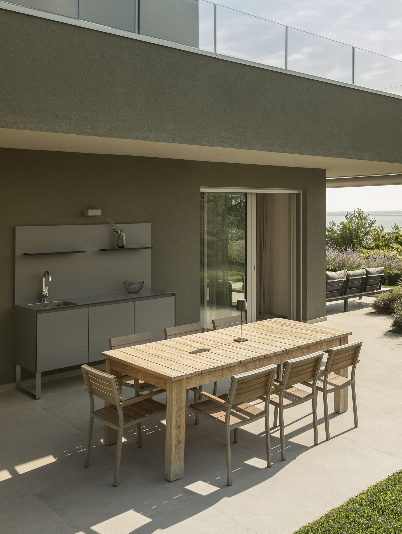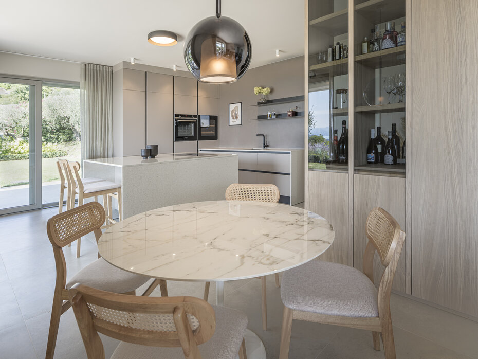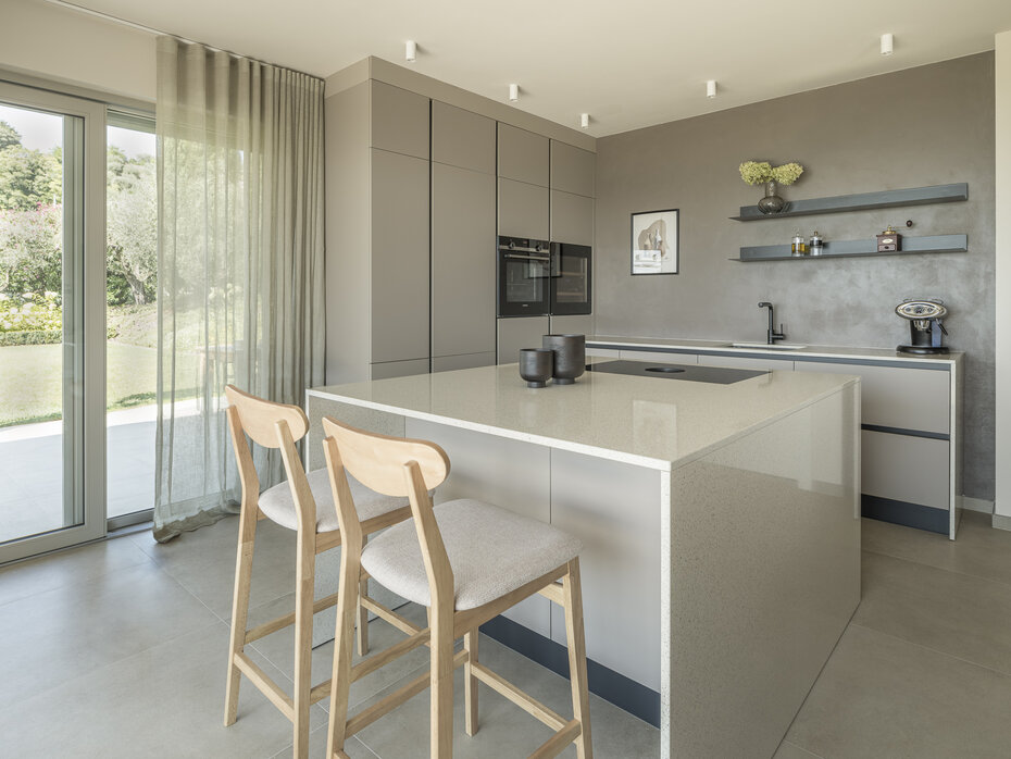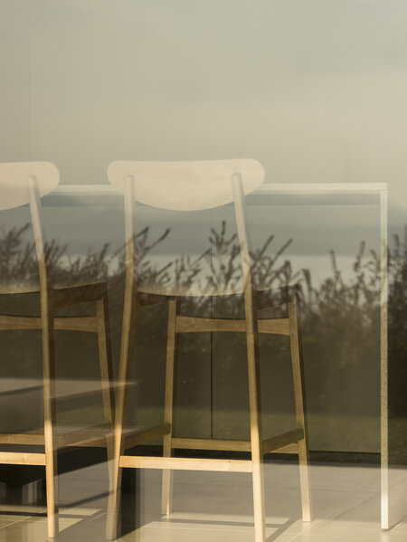 Das gemeinsam mit dem Kunden erarbeitete Interior-Konzept setzt auf ein schlichtes, modernes Design. In Anlehnung an die geografische Lage wurden sorgfältig Materialien und Farben ausgewählt, die ein harmonisches Gesamtbild ergeben. Die Innenarchitektur zieht sich nach außen über die Terrasse und schafft so einen fließenden Übergang zwischen Innen- und Außenbereich.