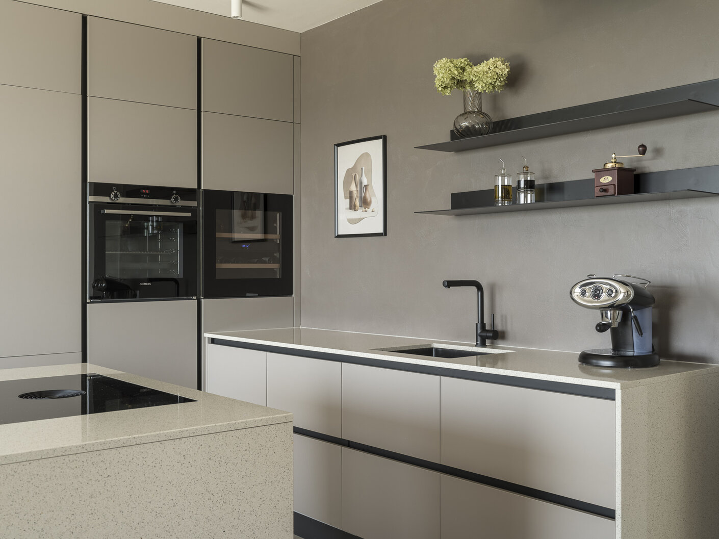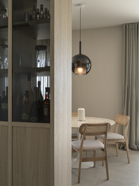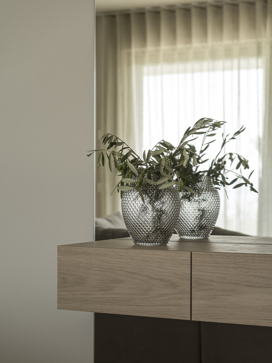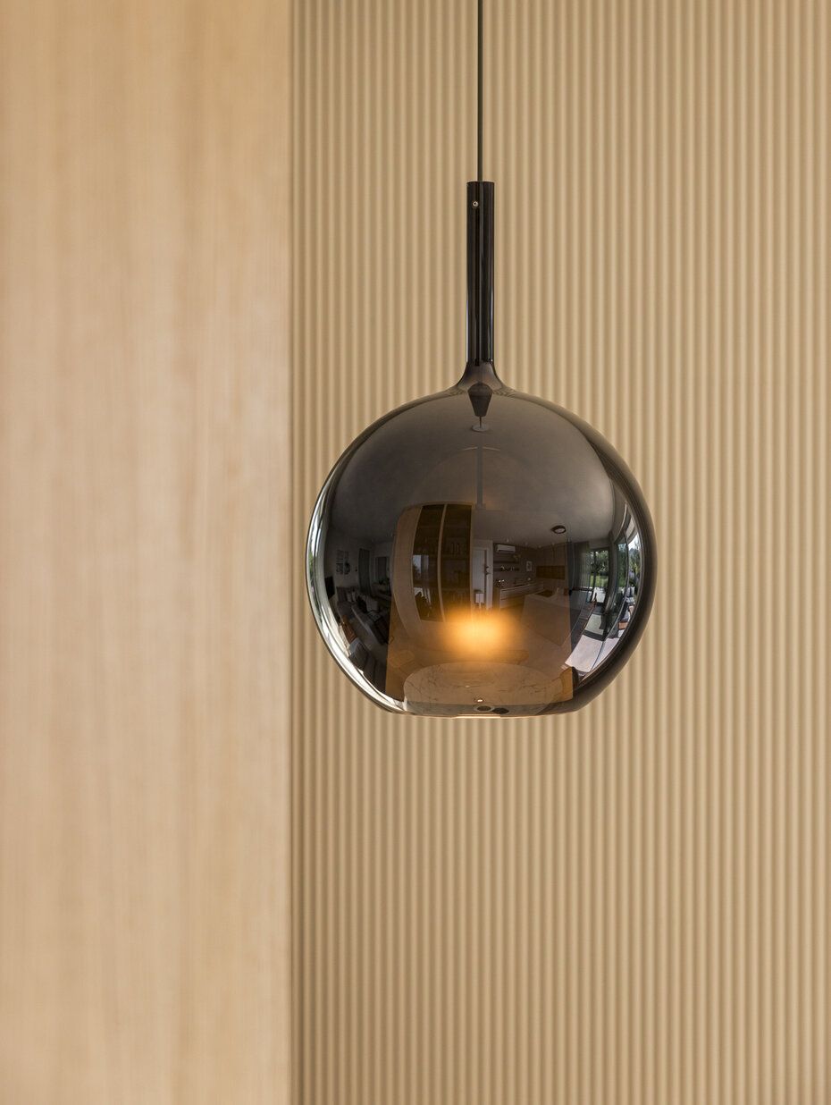 Das gemeinsam mit dem Kunden erarbeitete Interior-Konzept setzt auf ein schlichtes, modernes Design. In Anlehnung an die geografische Lage wurden sorgfältig Materialien und Farben ausgewählt, die ein harmonisches Gesamtbild ergeben. Die Innenarchitektur zieht sich nach außen über die Terrasse und schafft so einen fließenden Übergang zwischen Innen- und Außenbereich.